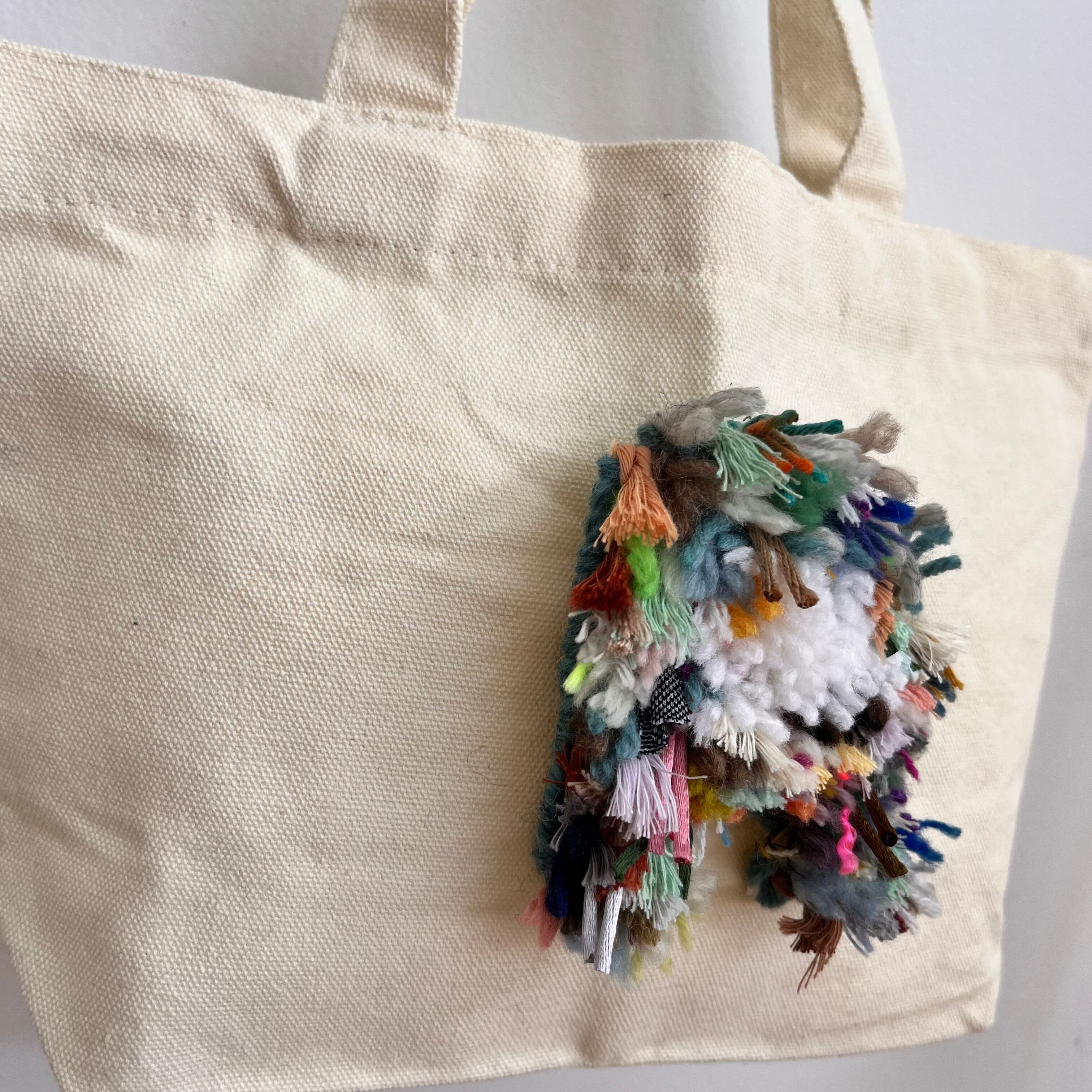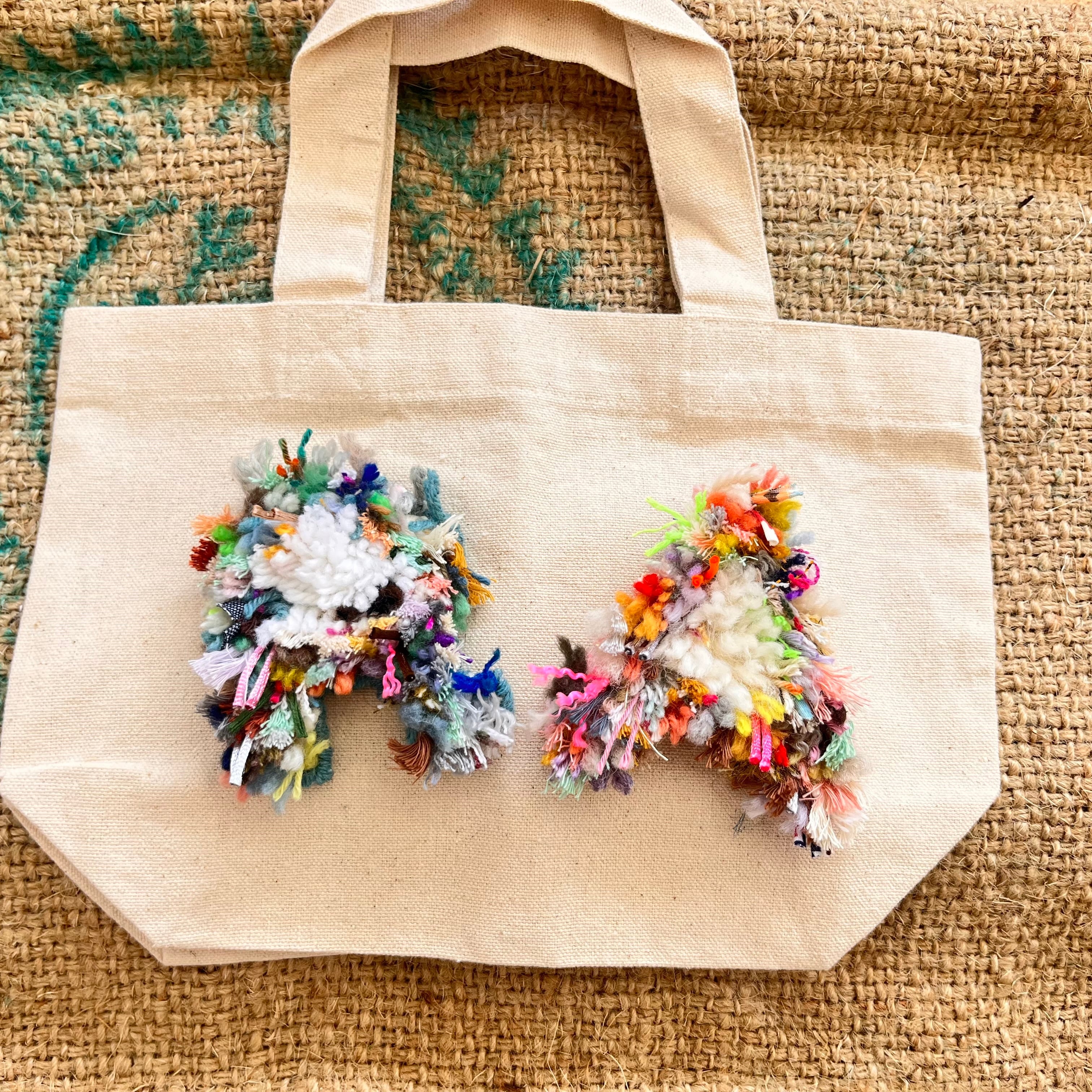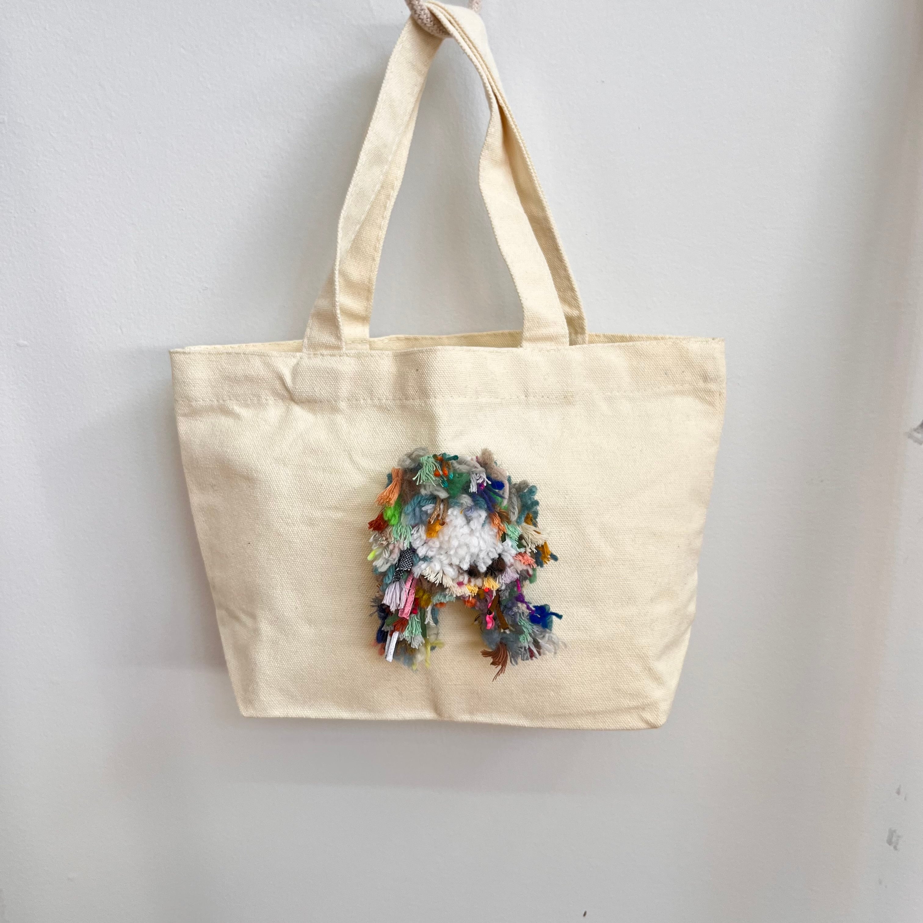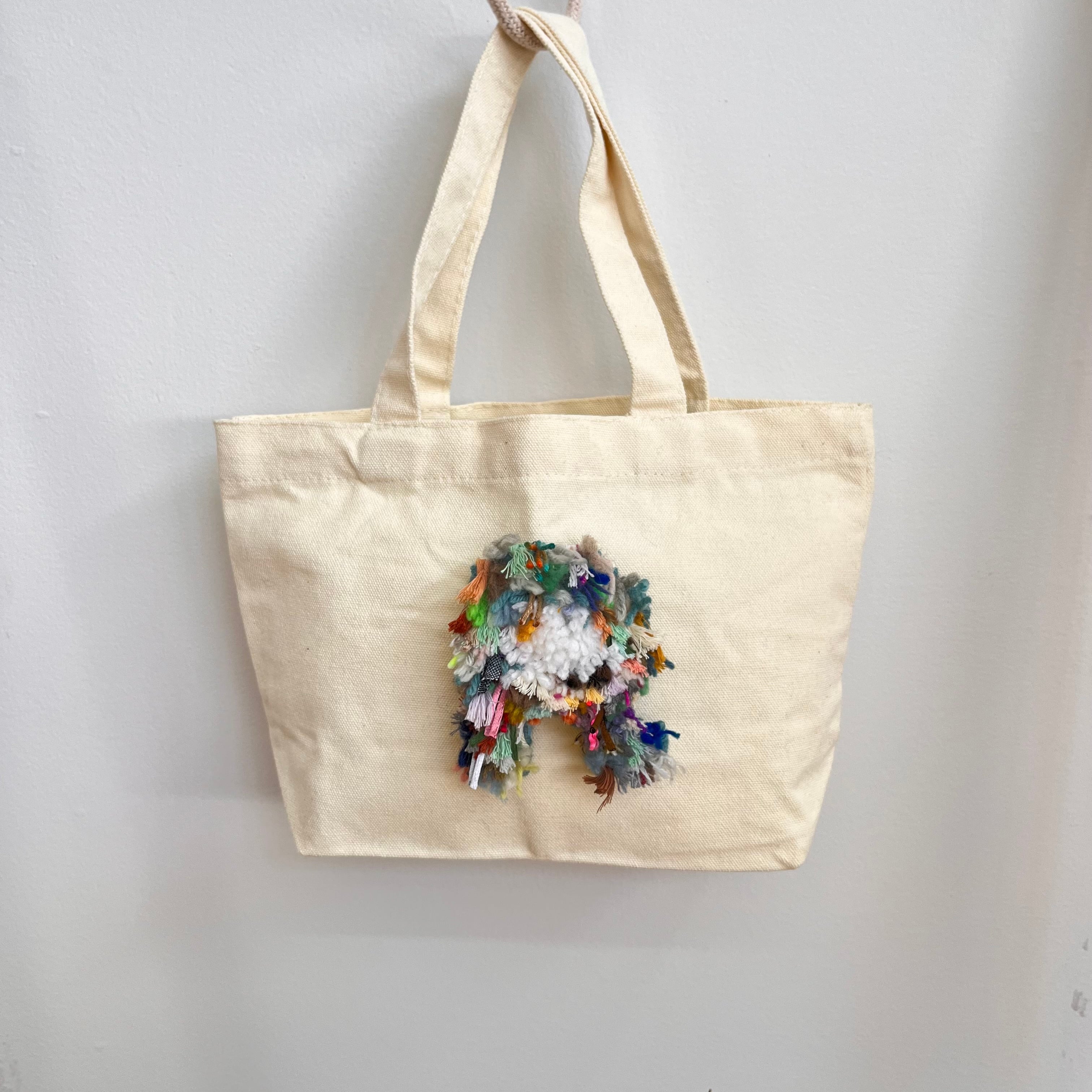 ラッチフックでひとつひとつ手作りした、カラフルなアルファベットをあしらったミニトートバッグです。
