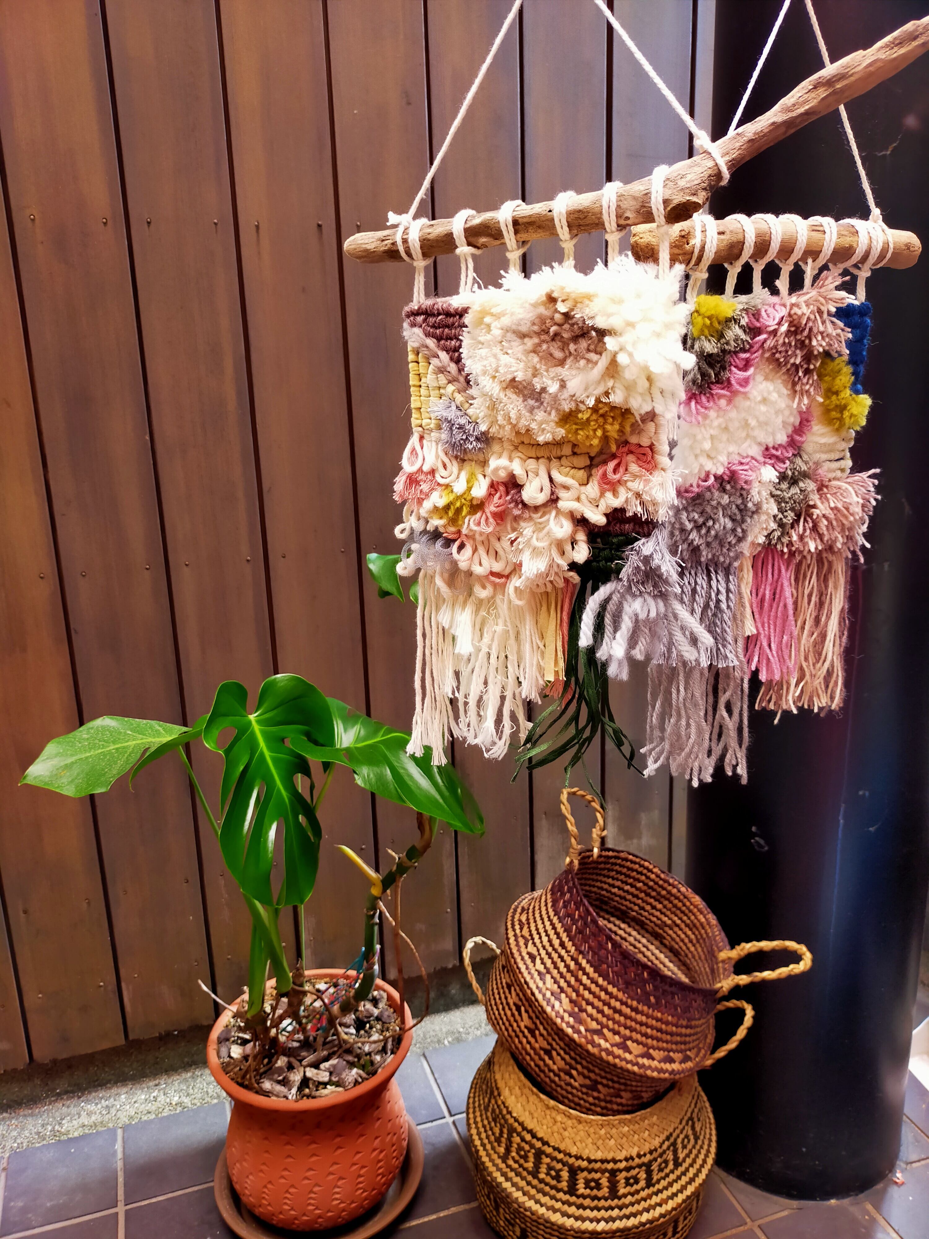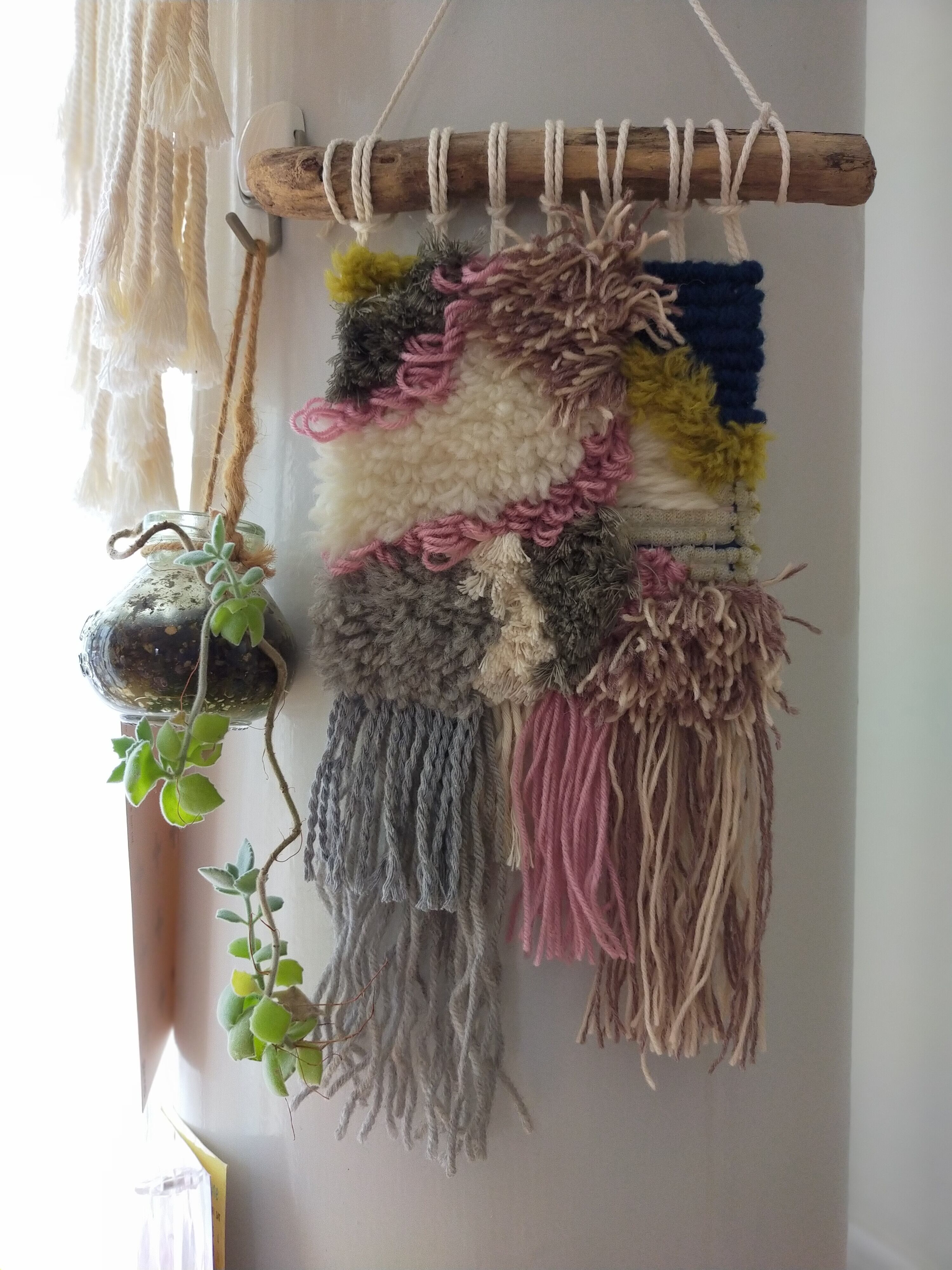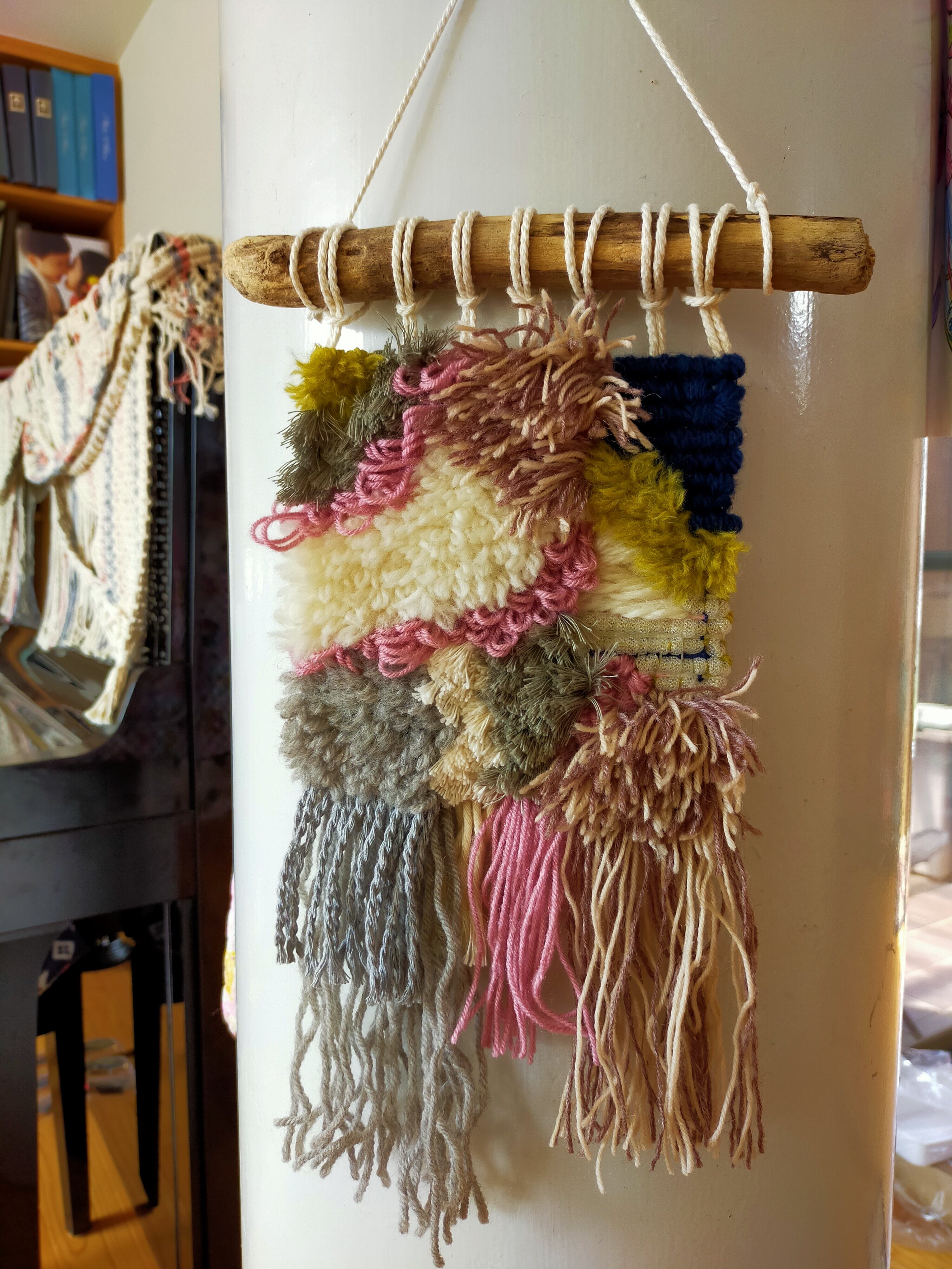 "ラッチフック""ロッカーフック"で作ったタペストリーです。毛糸・オーガニックコットンを使用しています。飾りやすい小さめのサイズにつくりました。お部屋のアクセントに!!