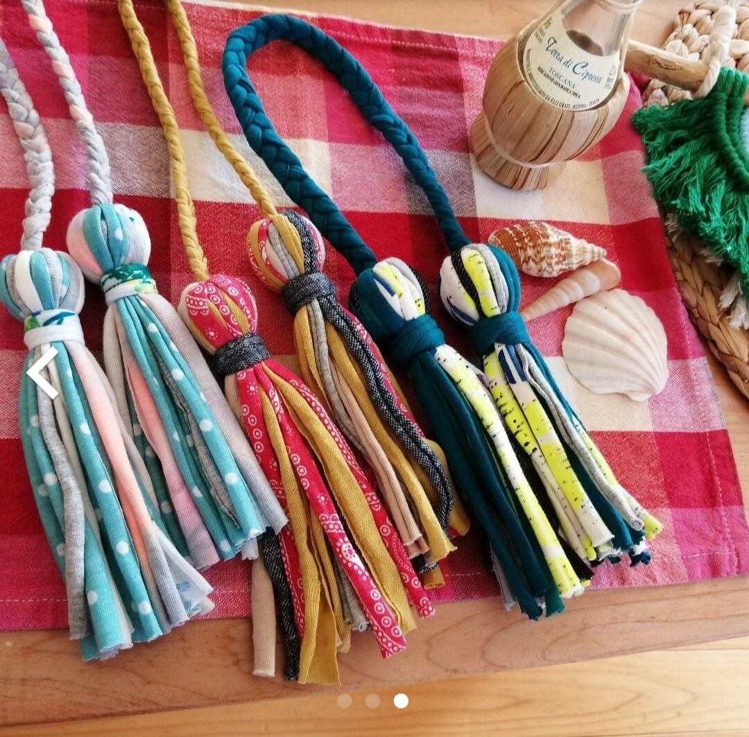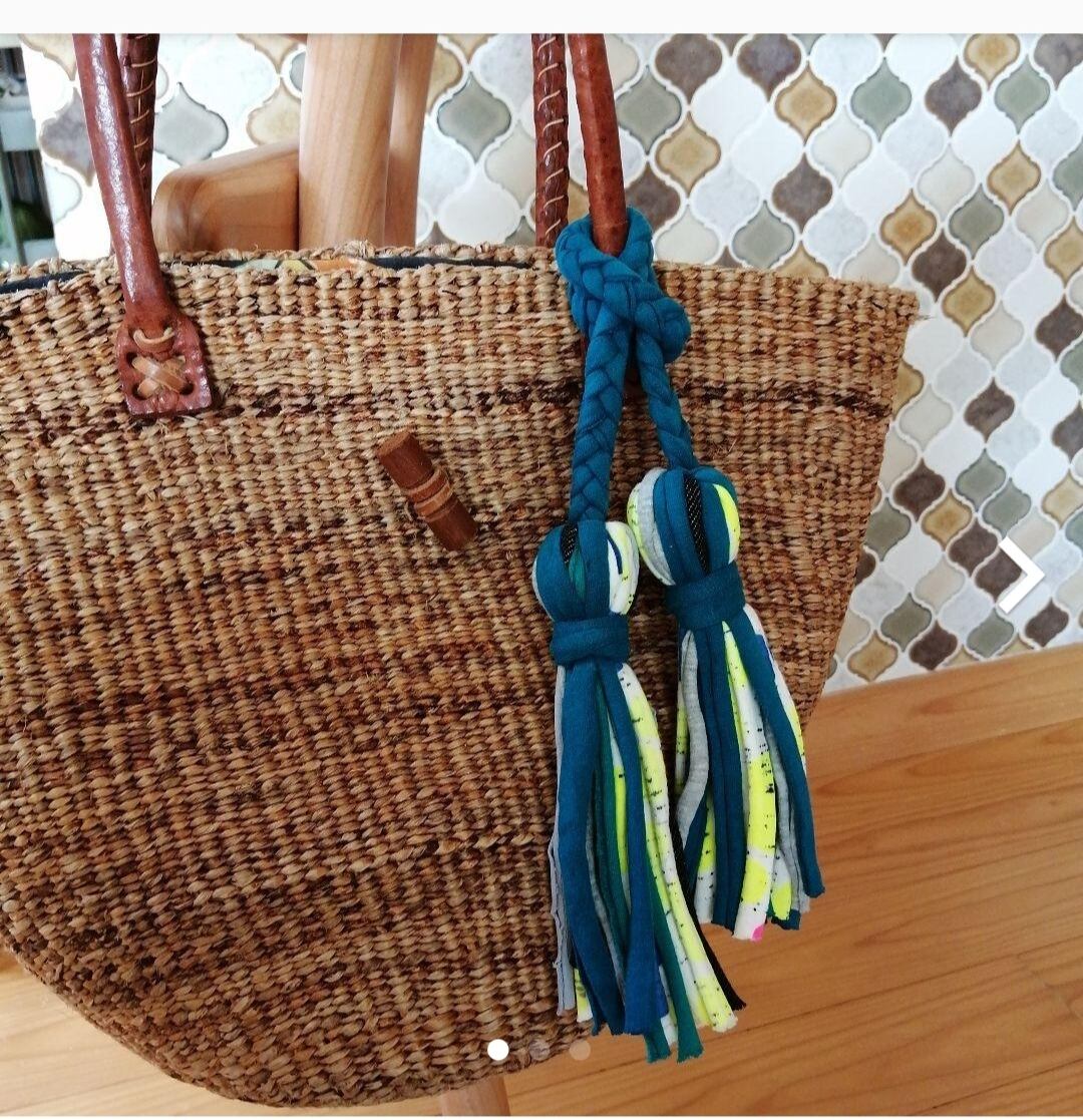 こちらはTシャツヤーンの特徴上、左右のタッセルの大きさが少し異なります。気になる方は購入お控え下さいませ。