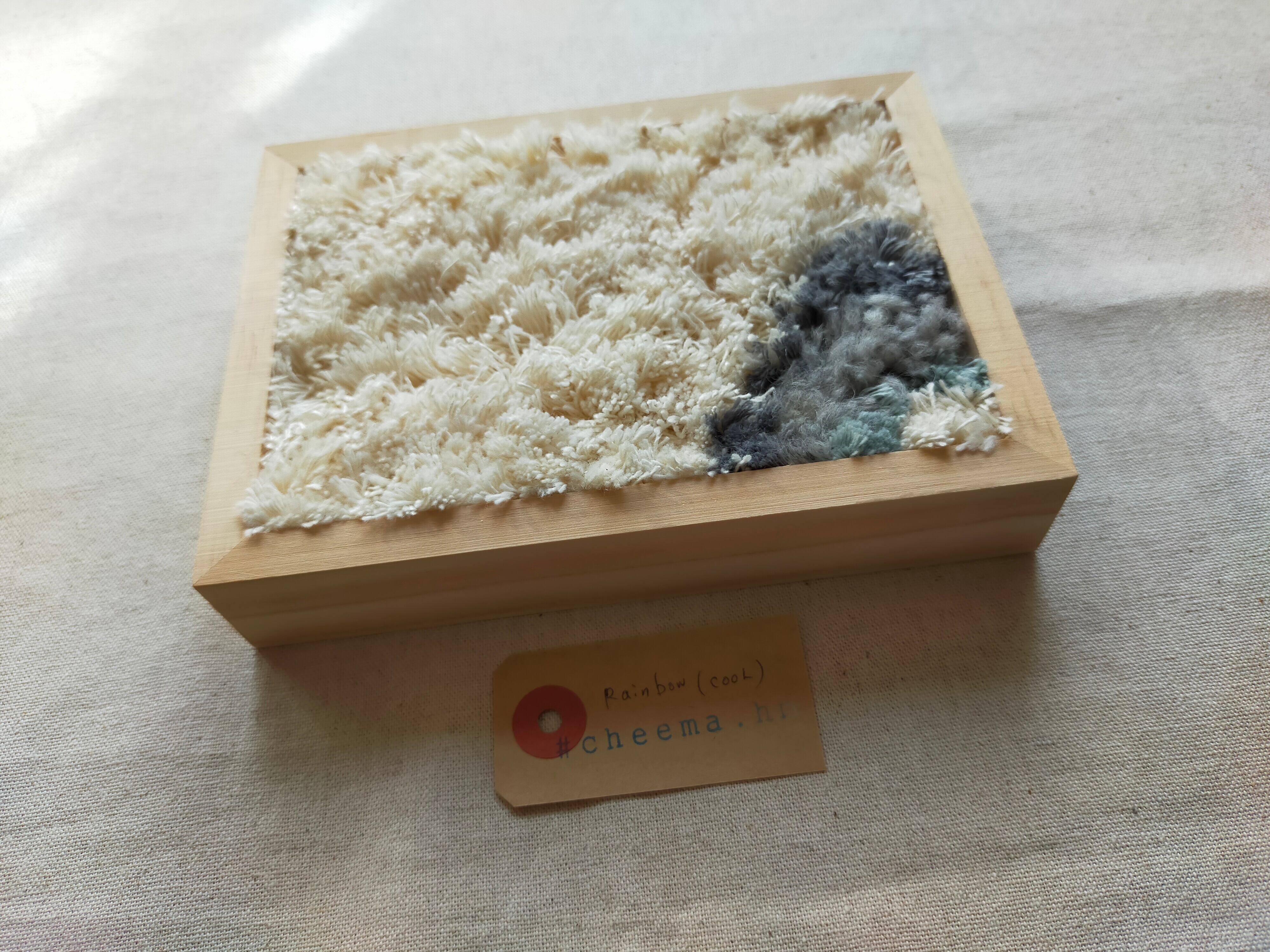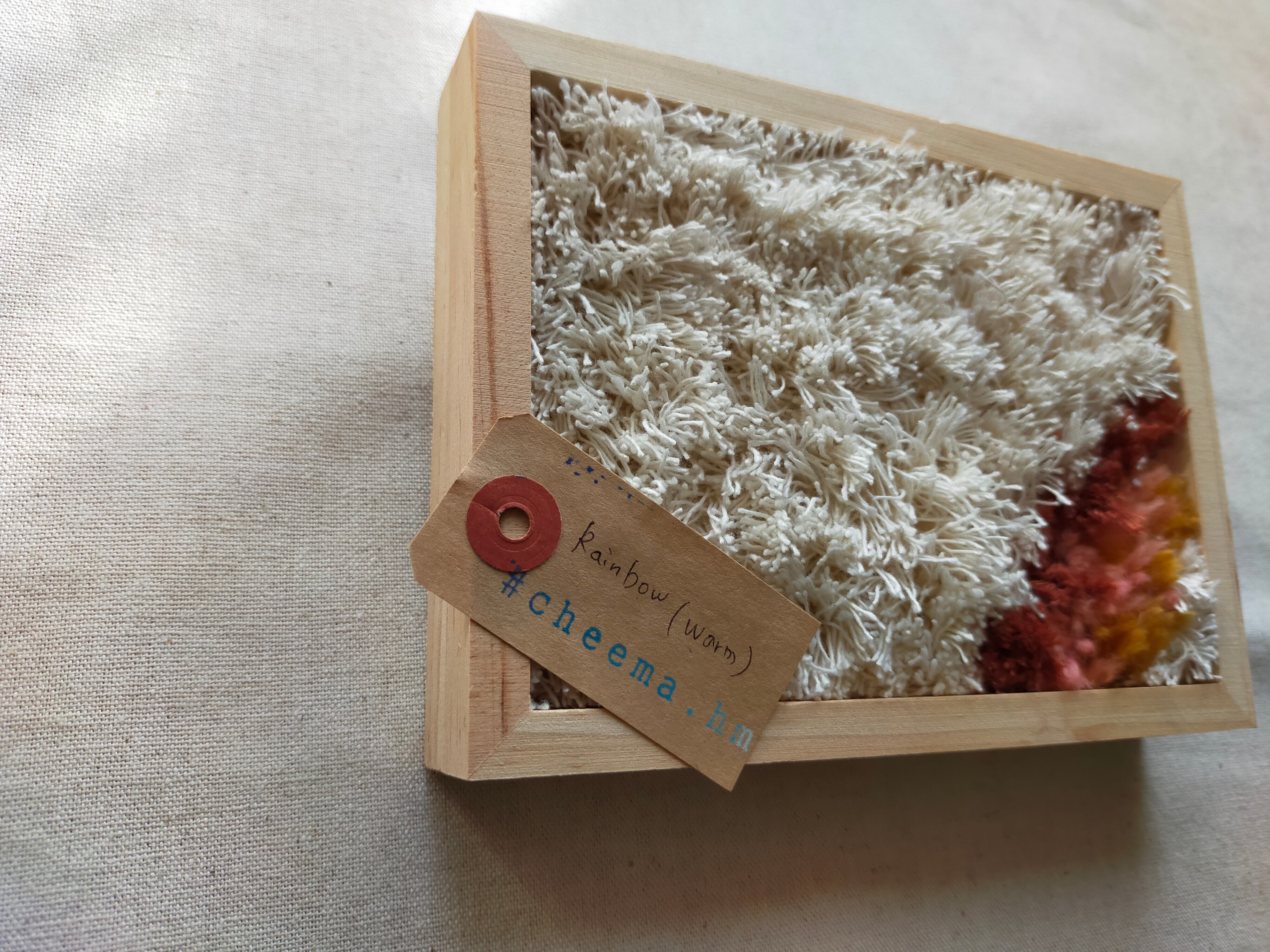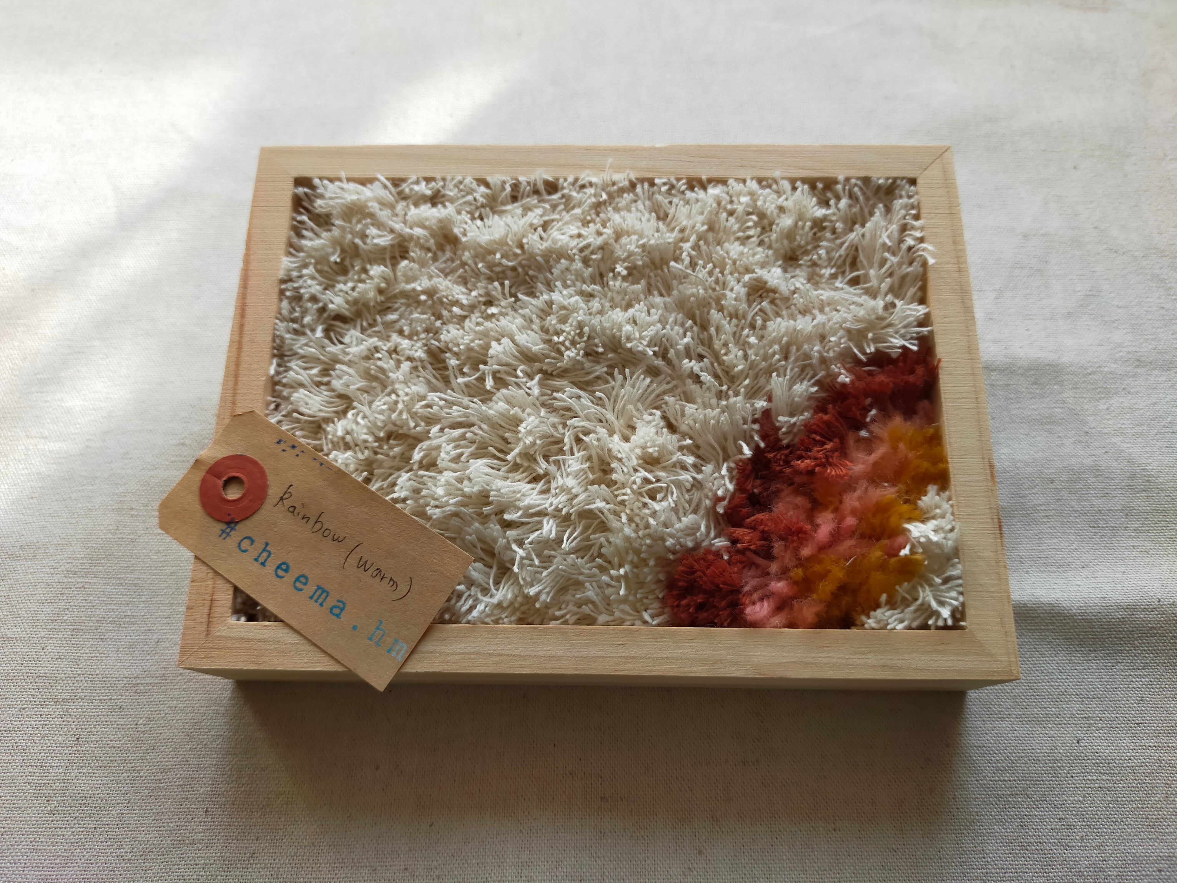 厚みのある木製フレームにラッチフックでレインボーを作りました。