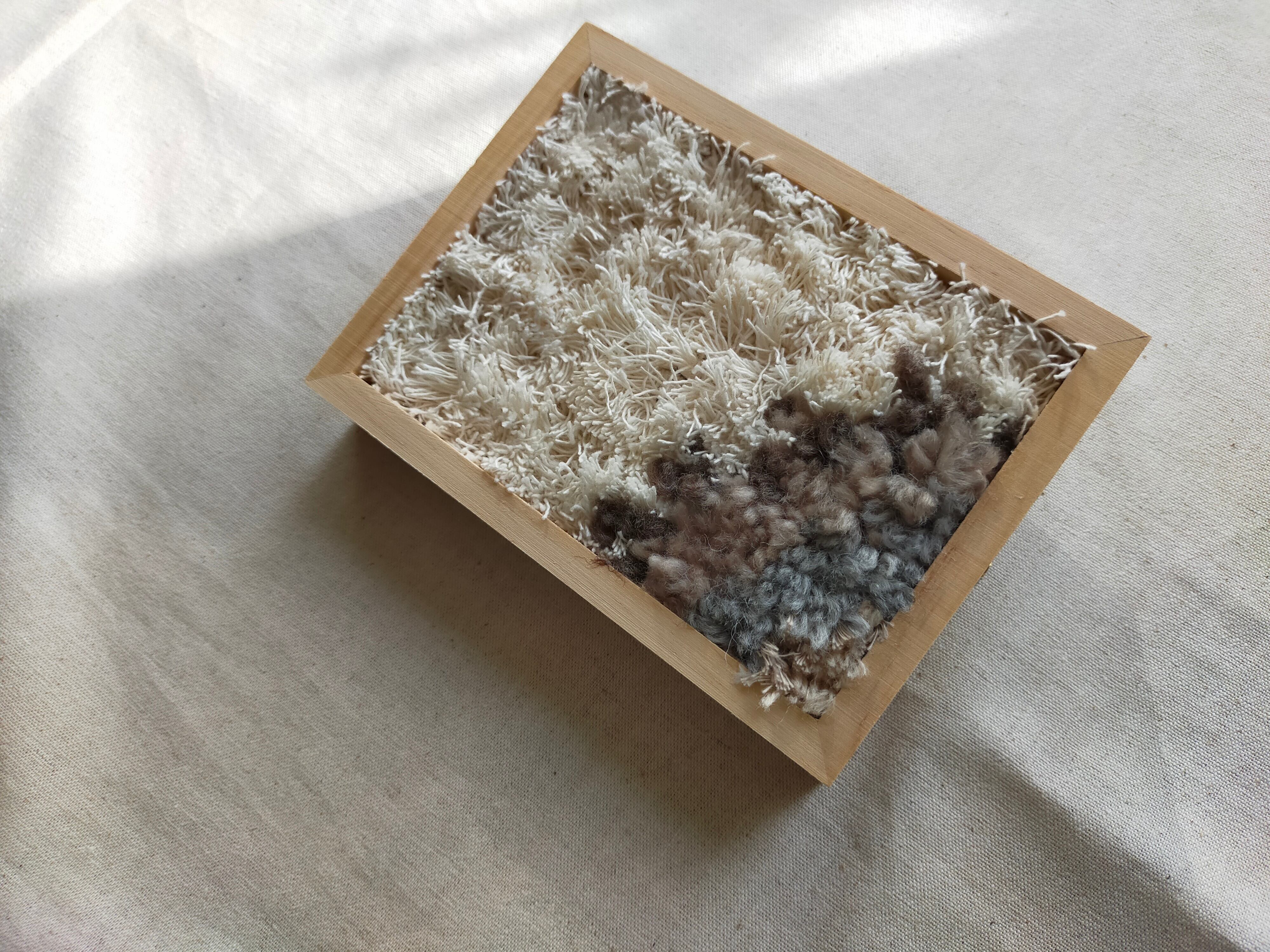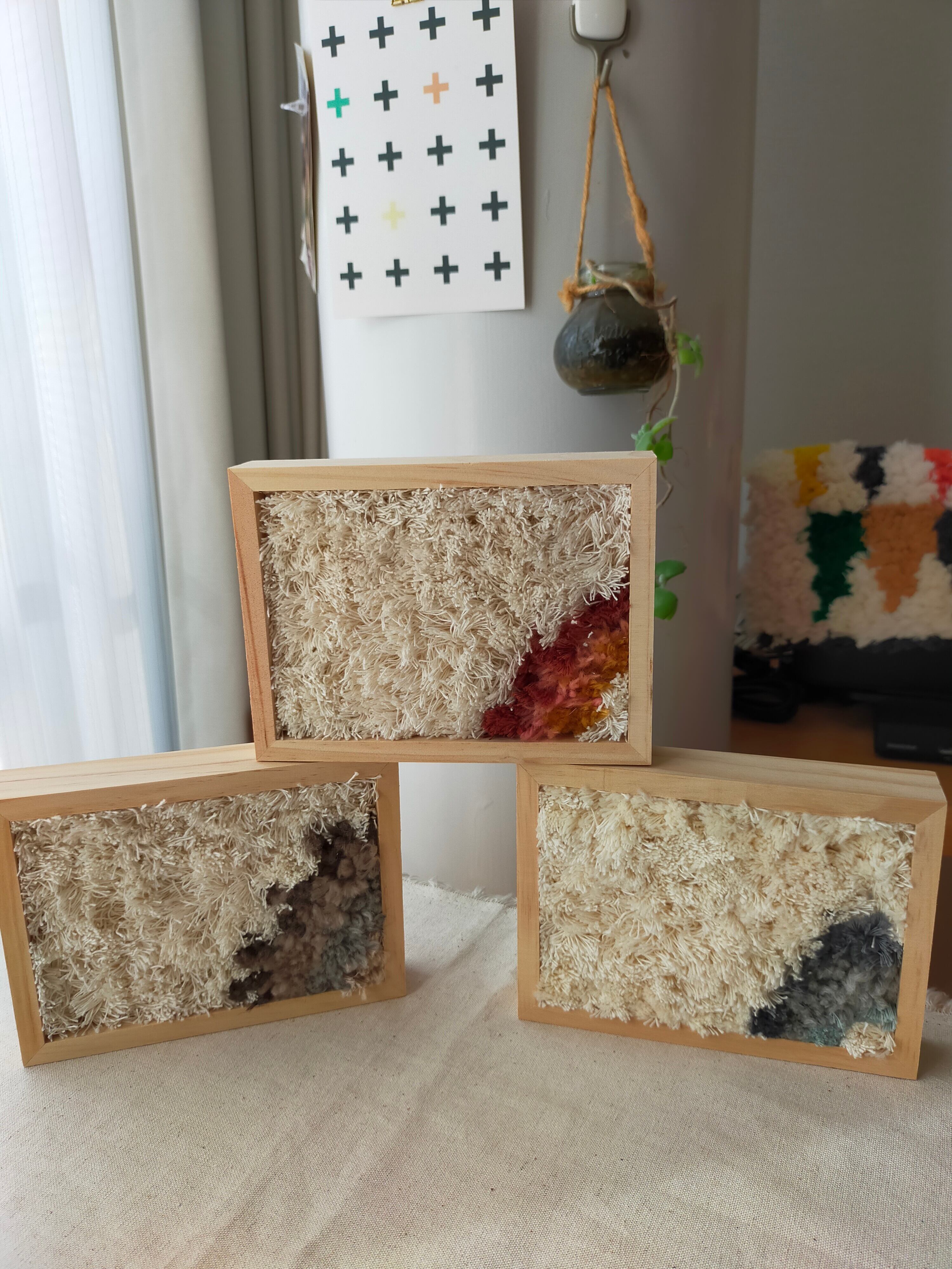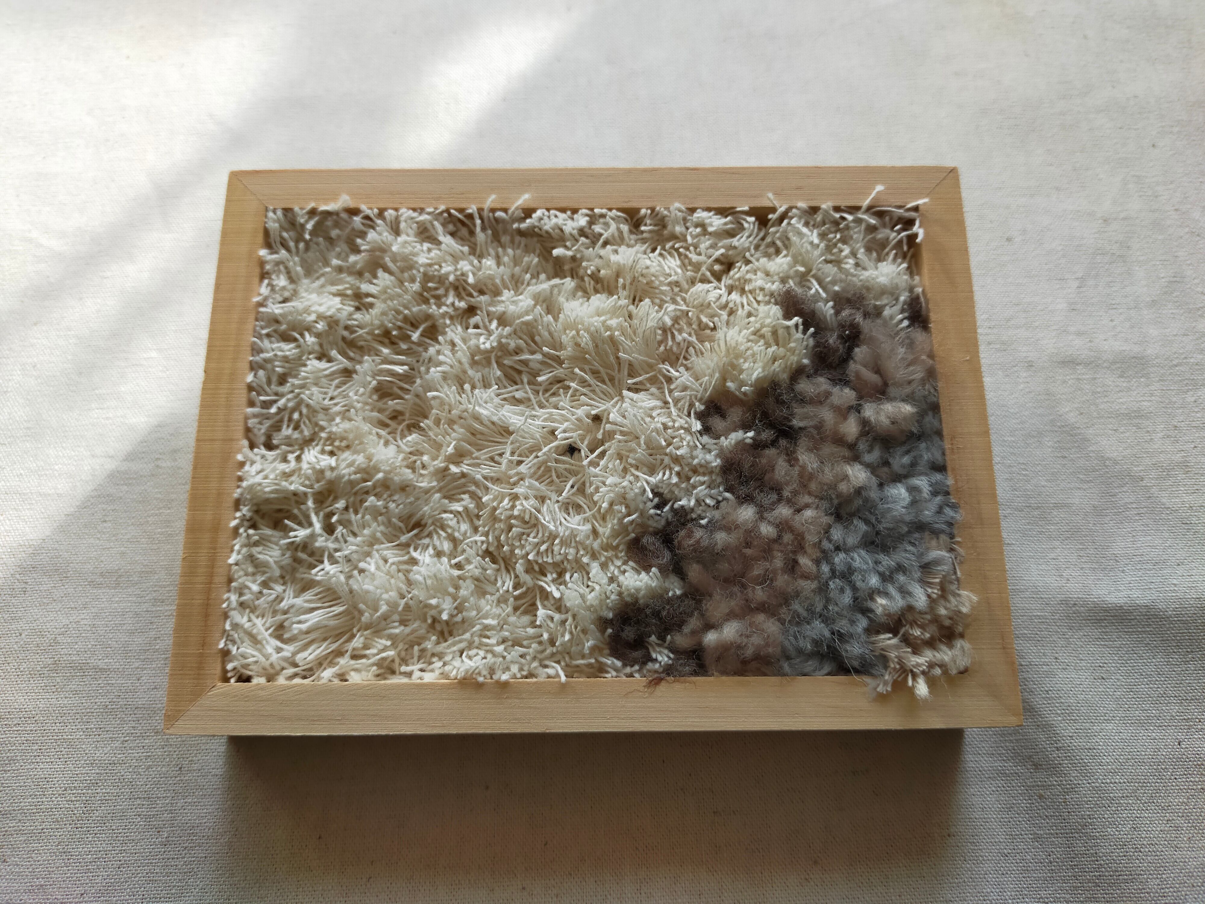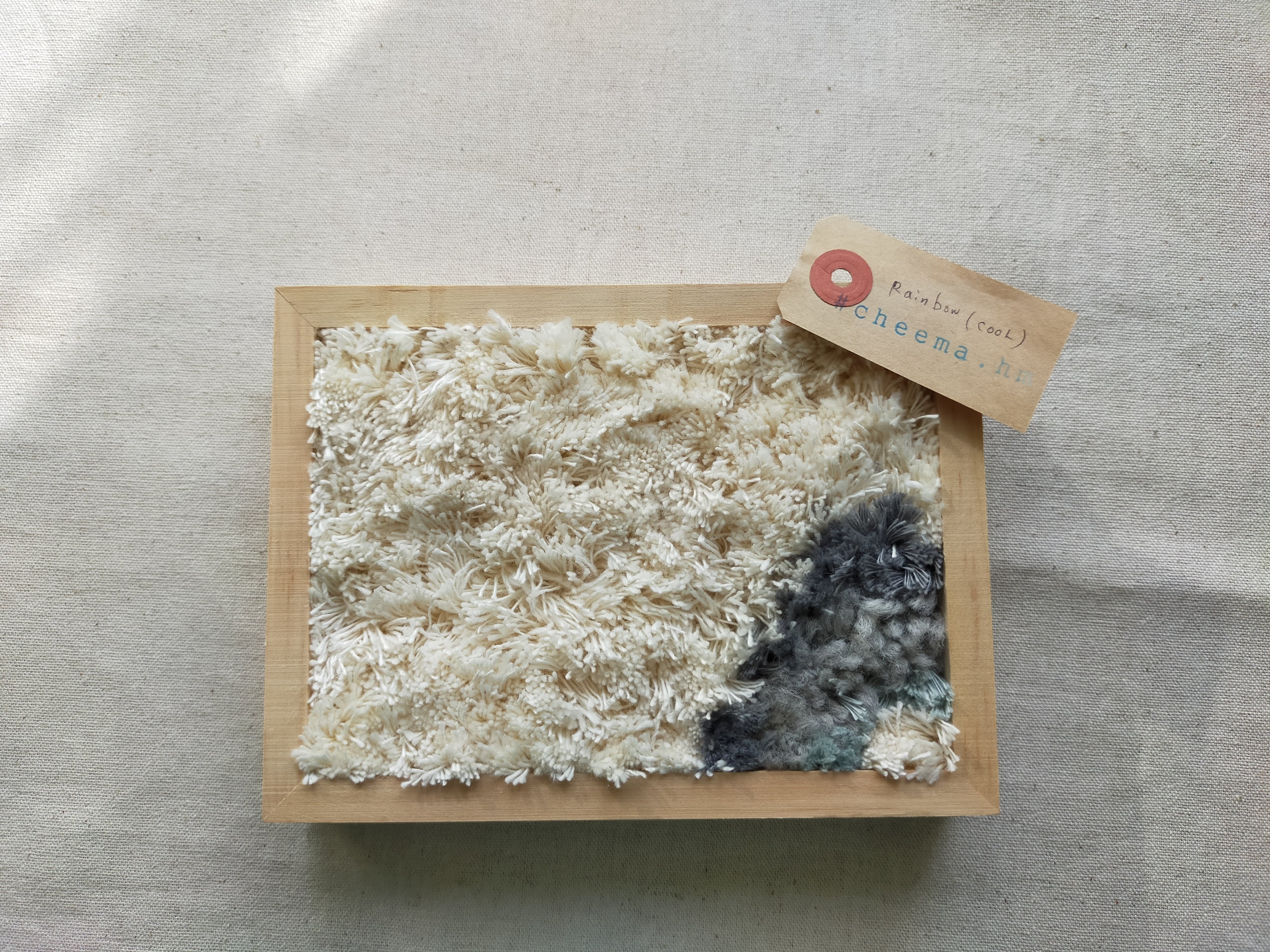 厚みのある木製フレームにラッチフックでレインボーを作りました。